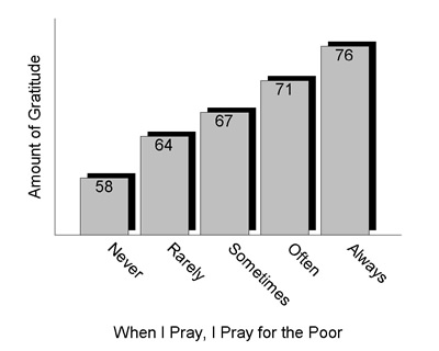 - Technical note: I have considered the possibility of the relationship going the other way–that being more grateful leads one to pray for the poor. I used a reasonably sophisticated statistical procedure (called a two-stage least squares regression) to examine this issue and found that prayer for the poor does indeed lead to gratitude.